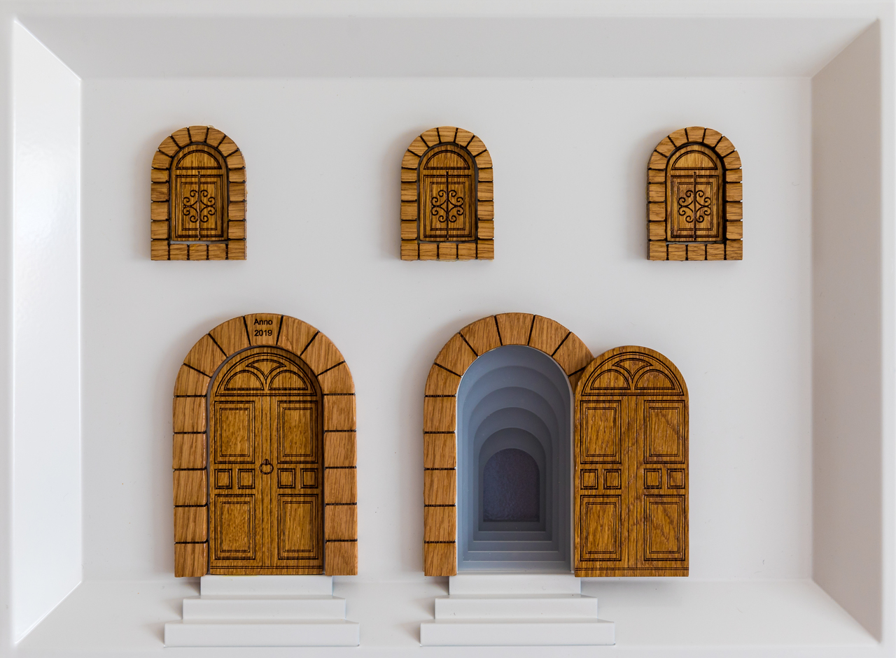 Stalen gepoedercoat schilderij met licht eiken houtwerk en gang met diepte van satin plexiglas Als één deur sluit gaat er altijd een andere deur voor je open ? Blijf daarom niet te lang kijken naar de gesloten deur Volg je hart?