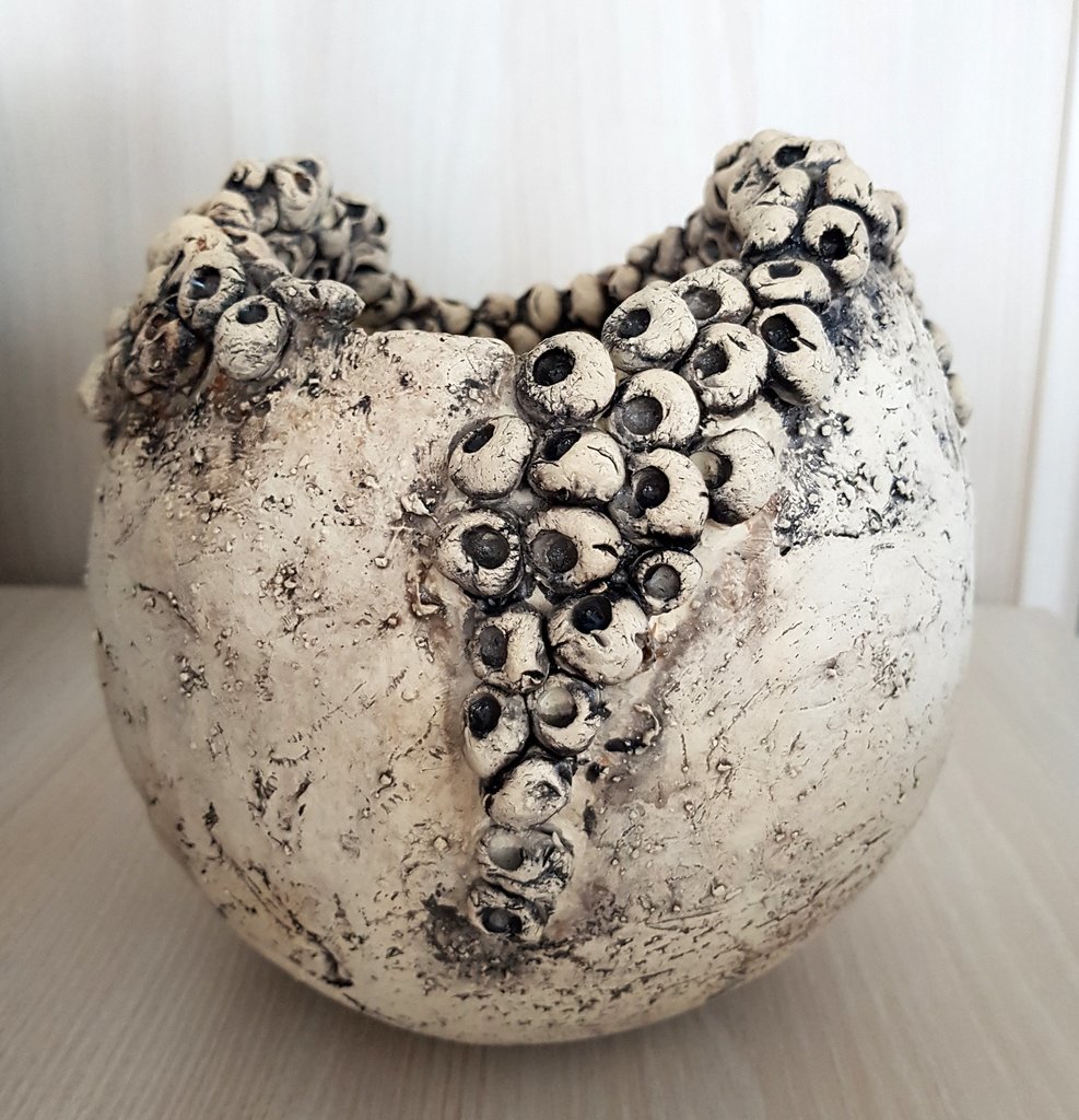 Coralbowl, ingewassen klei, keramiek Naturel ronde vaas-object met koraalachtige spots. ingewassen met zwart