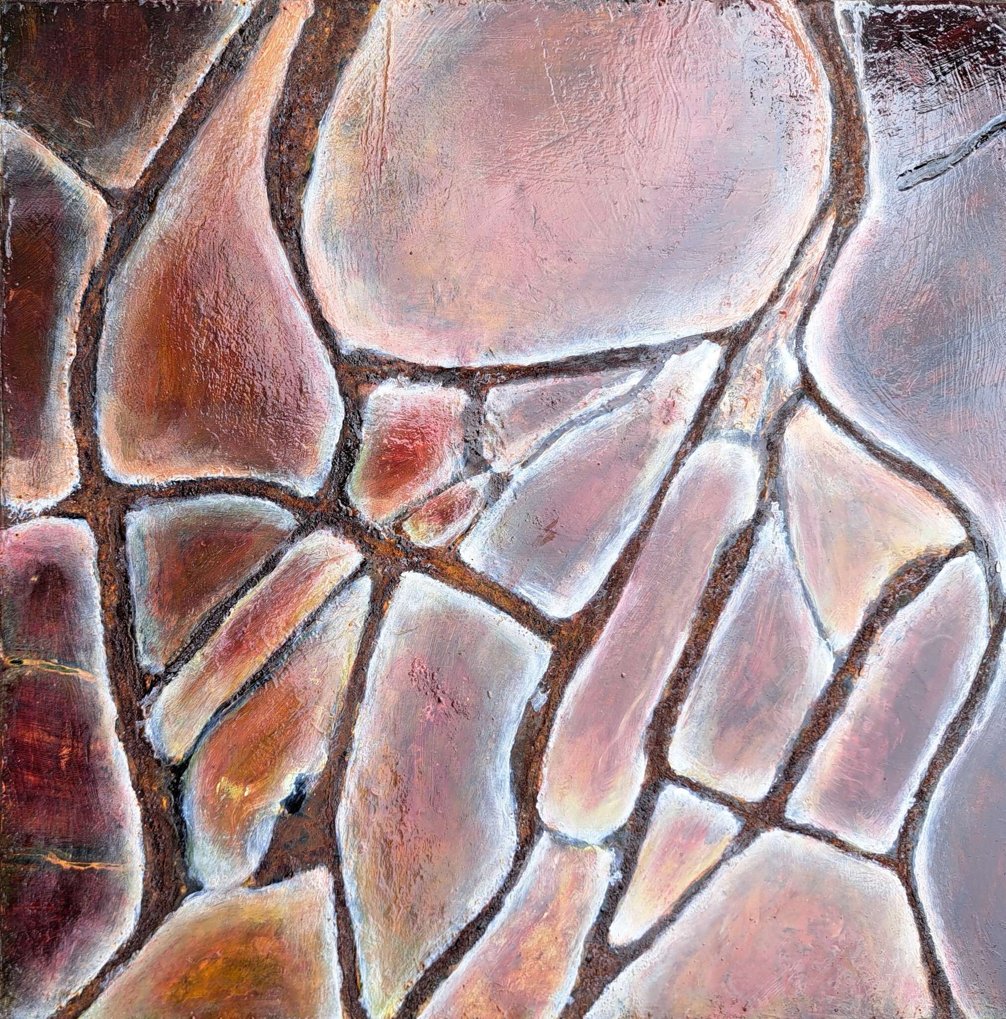 Stenen en bodemlagen. Dood materiaal, maar door kleuren en op sommige stukken roestend staal toch levend. Olieverf op stalen paneel. 40x40cm