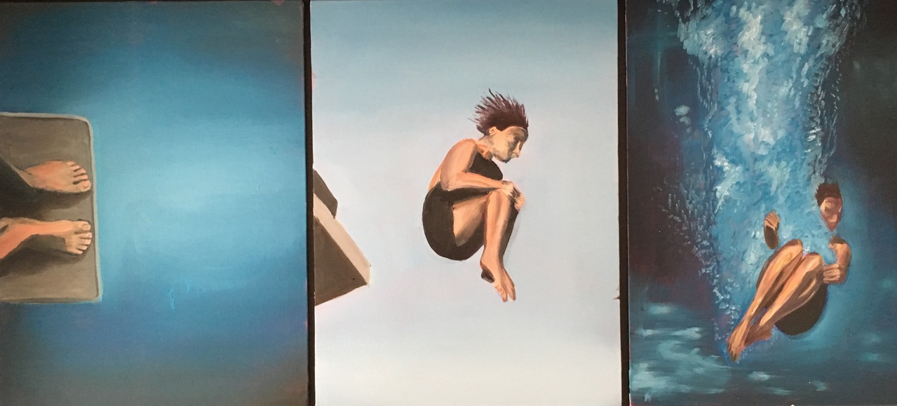Drieluik van dame die van een duikplank in het water springt. Olieverf op 3 panelen (canvasboard) van 40x50.