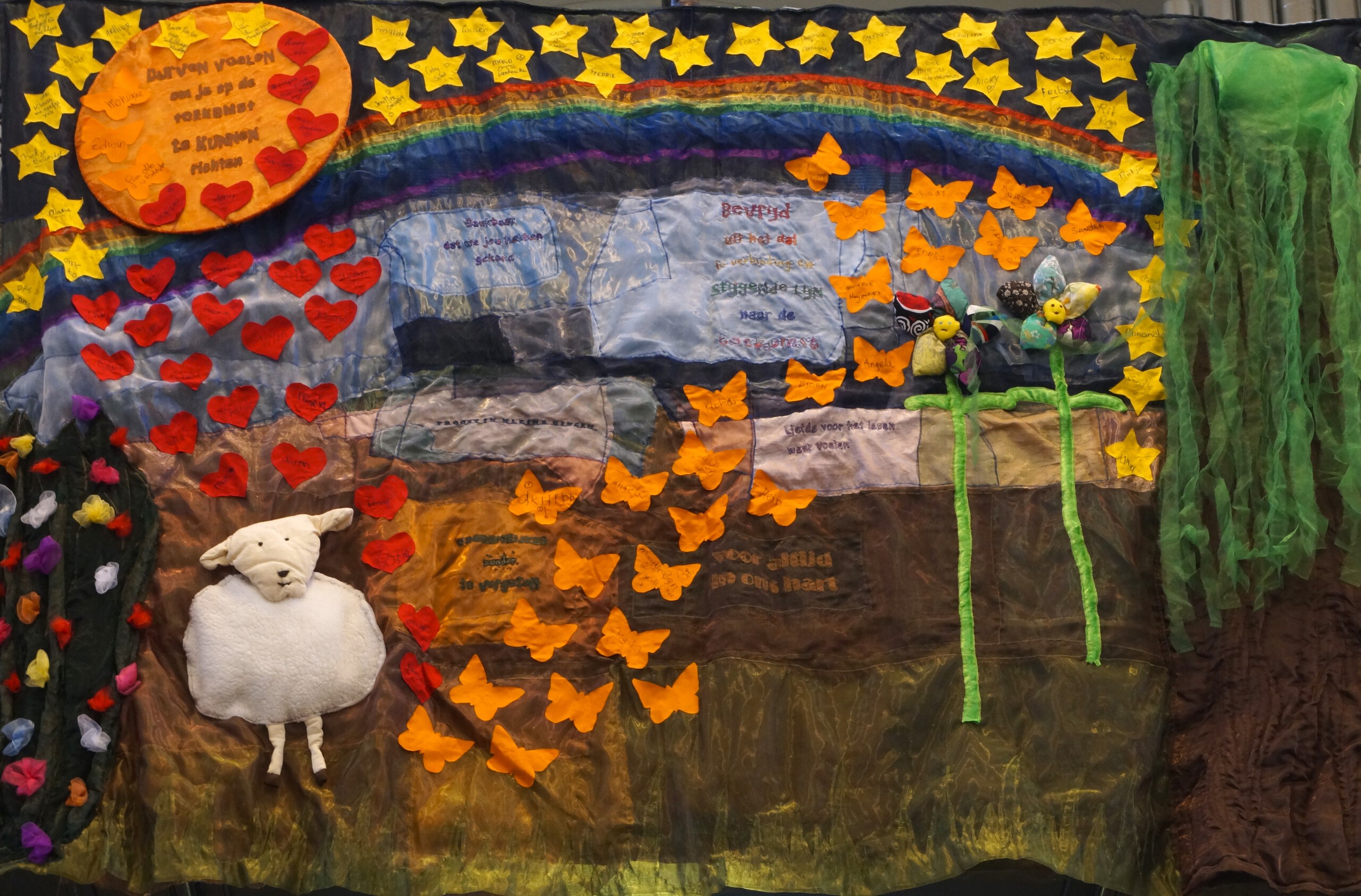 Herdenken van te vroeg overleden kinderen 2019. Textiel en tekst. Allerzielen begraafplaats Zoomvliet - Bergen op Zoom, Zeggestede - Roosendaal en Wereld Lichtjesdag Bergen op Zoom.