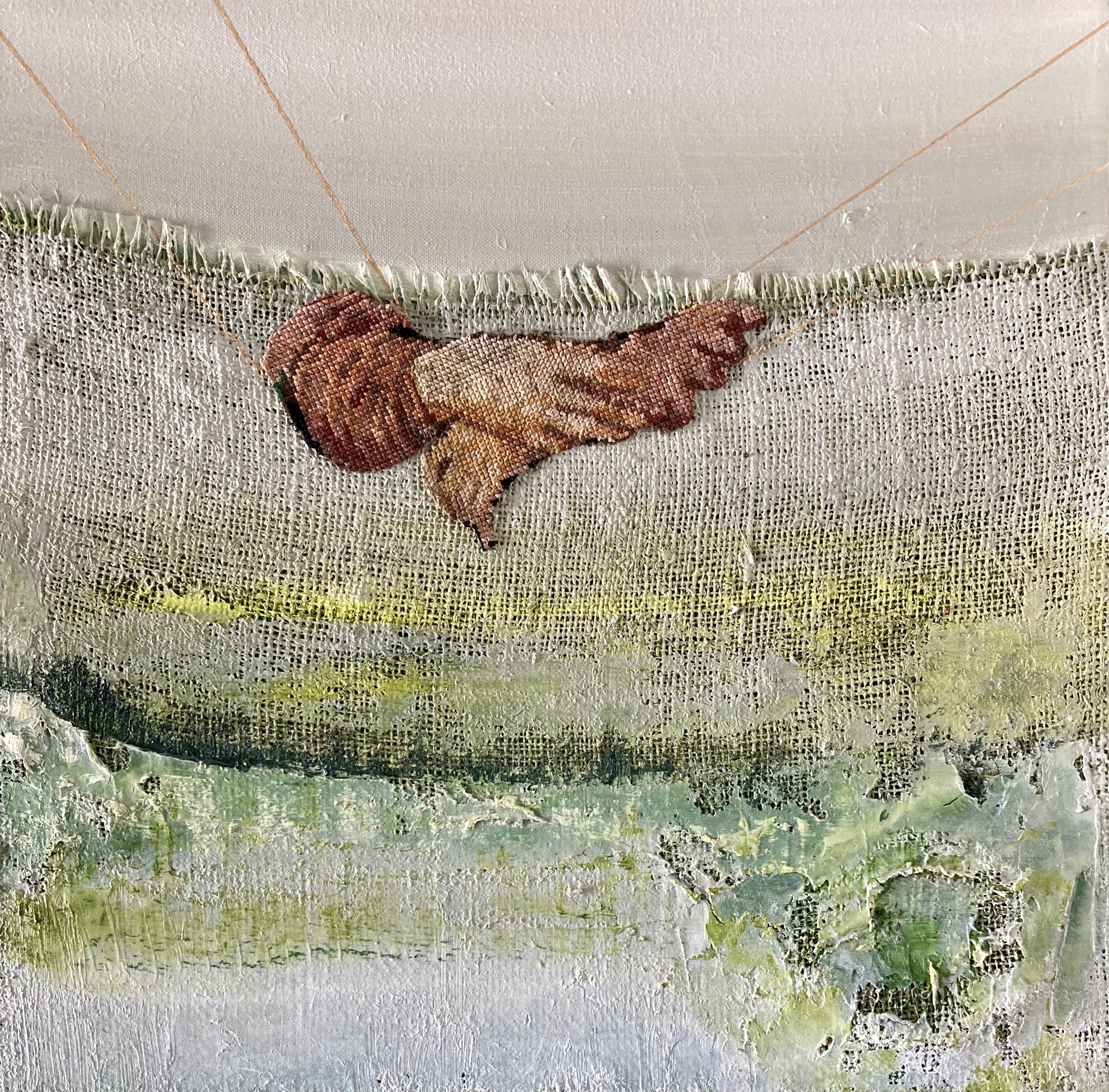 Groen Kunst Natuur Moderne Jute Verstilling Stilte Leegte Polderlandschap Meditatief Materiekunst Materieschilderen Vergrijsd Buitengevoel