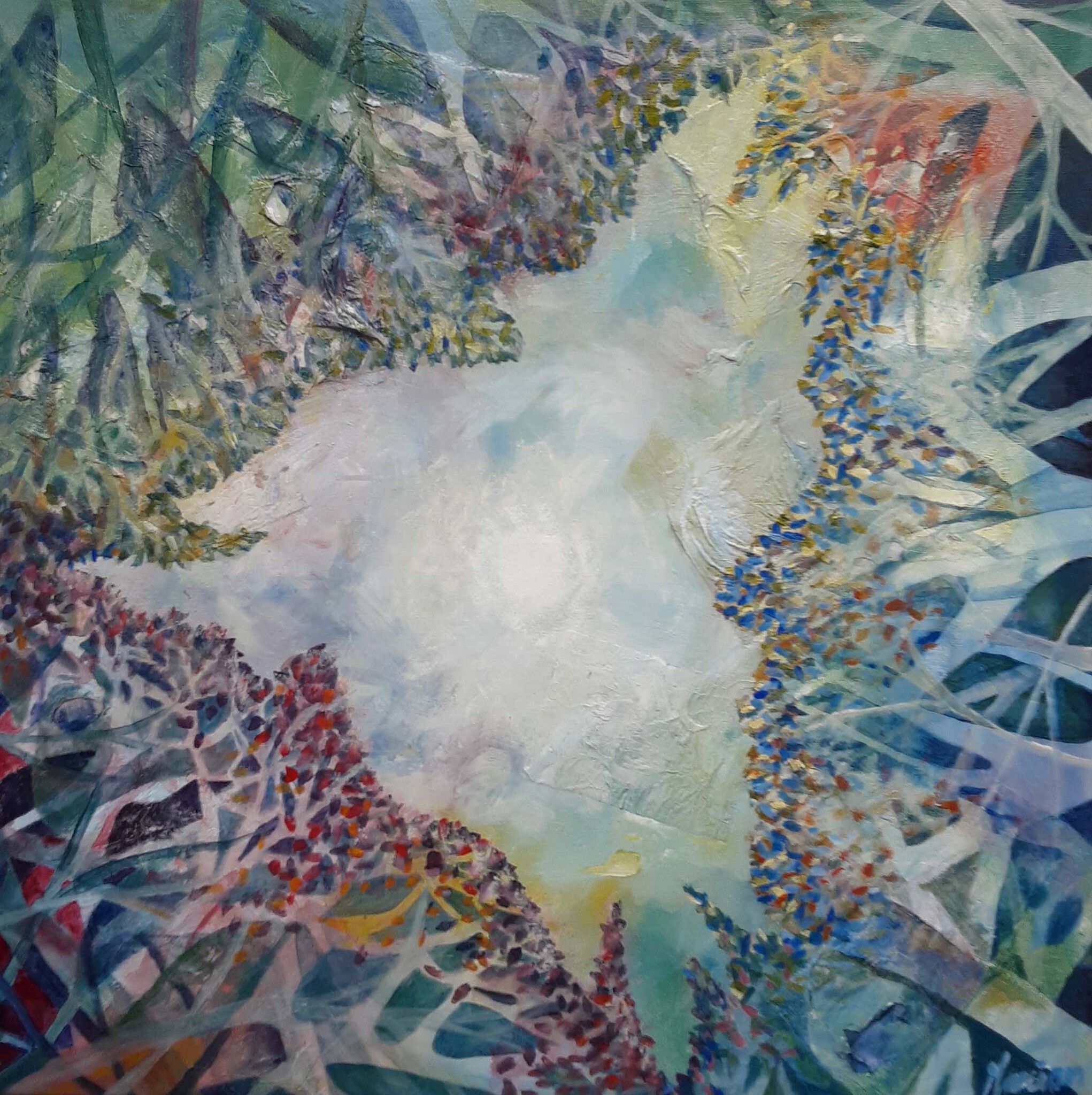 Kijkend naar de lucht, tussen bomen, zijn er 3 silhouetten te zien. Het is even zoeken voor sommigen. mixed media, acrylverf