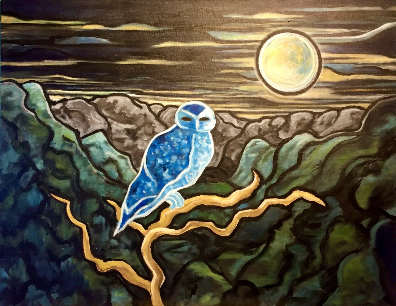 Mystieke voorstelling van een 'wijze' uil bij maanlicht....
