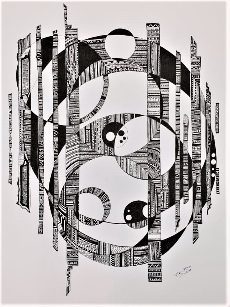 Deze pentekening is onstaan middels 'Sluieren van onwetenheid' die de geometrie en de wiskundige figuren verbind met natuurlijke vormen. Deze pentekening wordt verkocht inclusief lijst.