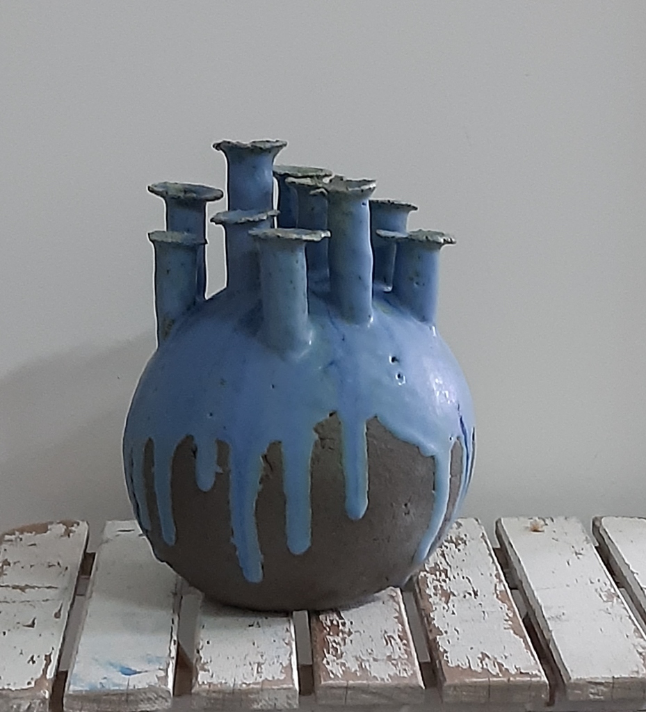 Handgevormde tulpenvaas van grijze klei. Deels geglazuurd met een mat kobaltblauw glazuur. Steengoed.