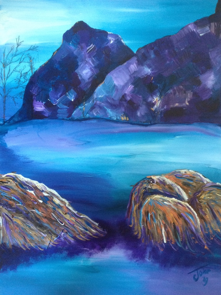 Blauw Acryl Paars Water Natuur Bergen Bomen Purple