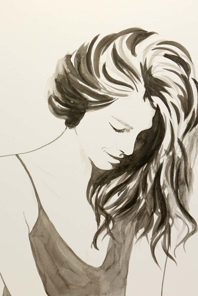 Schilderij Wit Mensen Emotie Vrouw Portret Bruin Lichaam Gezicht Aquarel Realistisch Mooi Bloot Kwetsbaar Sepia Haar Gebroken Kleur Lang Blote Dame Aquarelleren Portretten Tentoonstelling Kapsel
