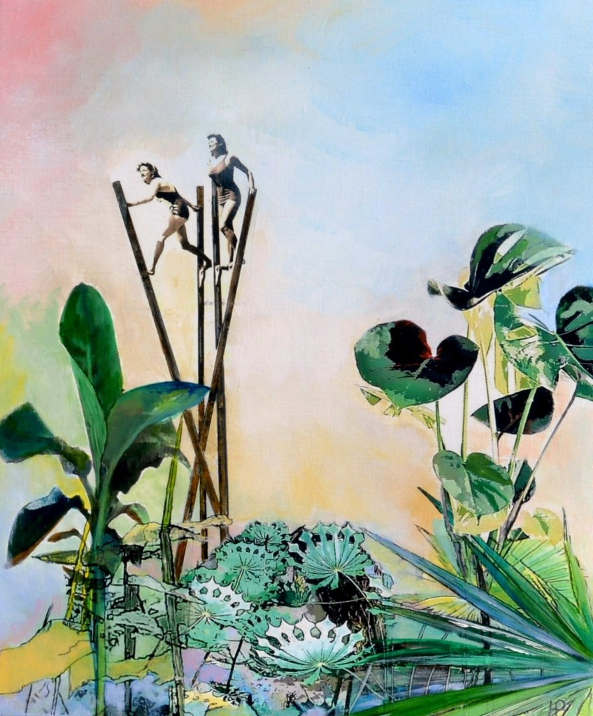 Een schilderij van 50 x60 cm. in de serie "Verbeelde schilderijen" De dames in retro stijl lopen op stelten, verheven boven de planten. Geschilderd met acryl en inkt .De kleuren zijn helder en in meerdere lagen opgebracht. Het schilderij is direct op te hangen. Linnen doek. VERKOCHT