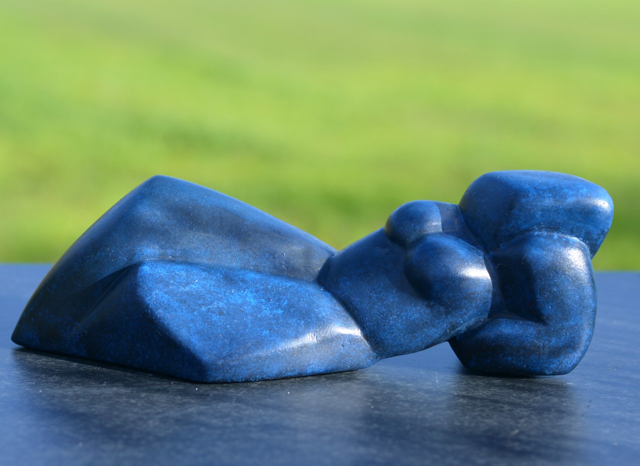 Een beeld gemaakt van kunsthars. Dit is het derde gietsel. Elke keer patineer ik het in een in een andere kleur. Kenmerkend is de voor mijn werk is de geabstraheerde vorm waarbij het detail ondergeschikt is.