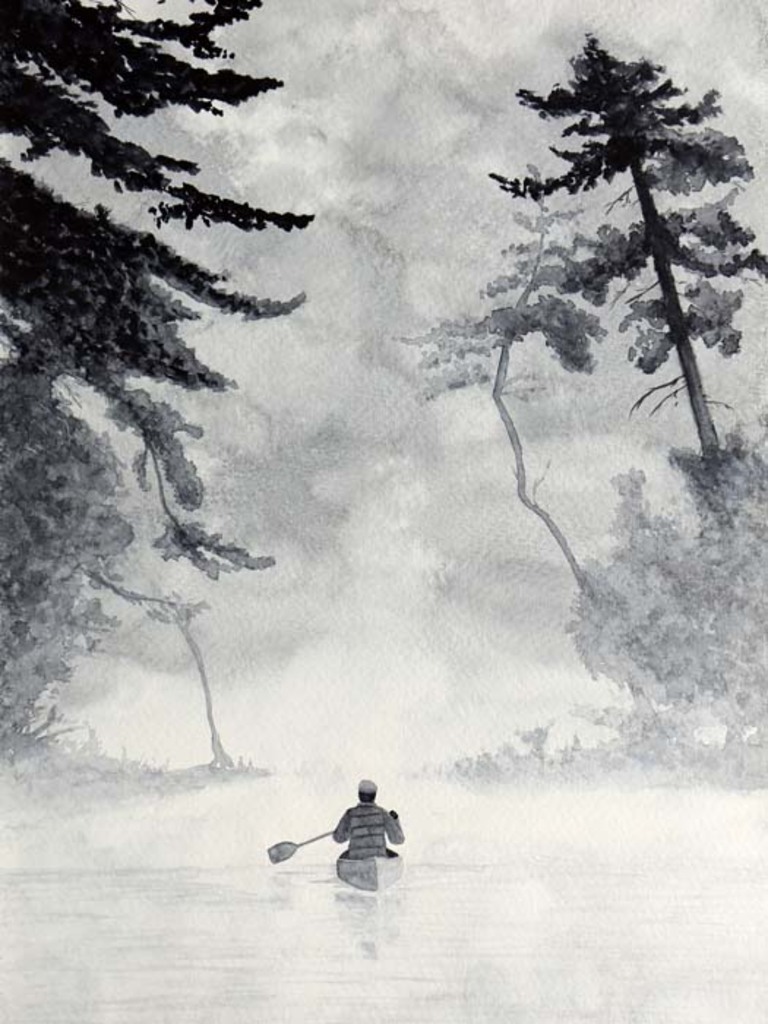 Schilderij Wit Grijs Zwart Water Handgemaakt Aquarel Schilderkunst Natuur Bomen Mist Origineel Rustgevend Sportief Sportschool Kunstwerk Avontuur Kano Uitvaart Tegemoet Wildernis Kanovaren Kajak