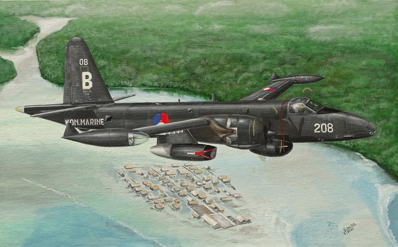 De Lockheed P2V-7B met de registratie 208 van de Marine Luchtvaartdienst in Nederlands Nieuw-Guinea, afgebeeld tijdens het uitvoeren van een Kampongverkenningsvlucht. Het “kampongsein” van de kampong op het water, bestond uit twee witgeschilderde boomstammen. Hier staat het op veilig; geen vijandelijke activiteit.