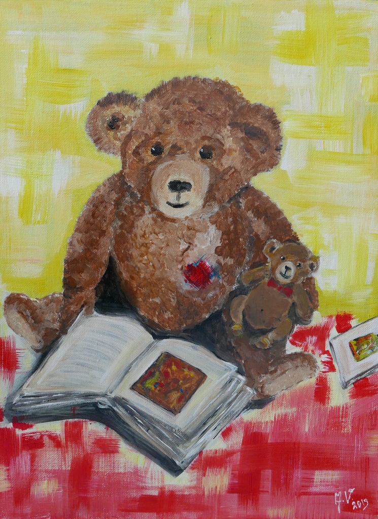 knuffelbeer met kleintje leest voor.