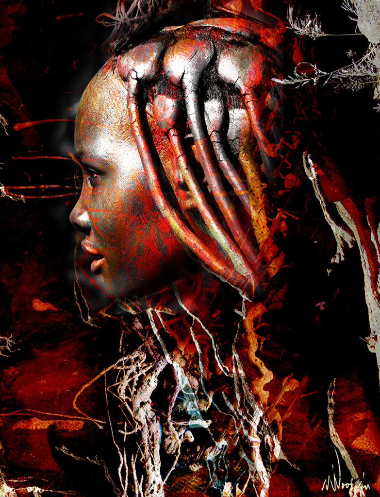 Grafische kunst op Dibond Diverse teken- en schildertechnieken, fotobewerking. Himba vrouw in Namibië