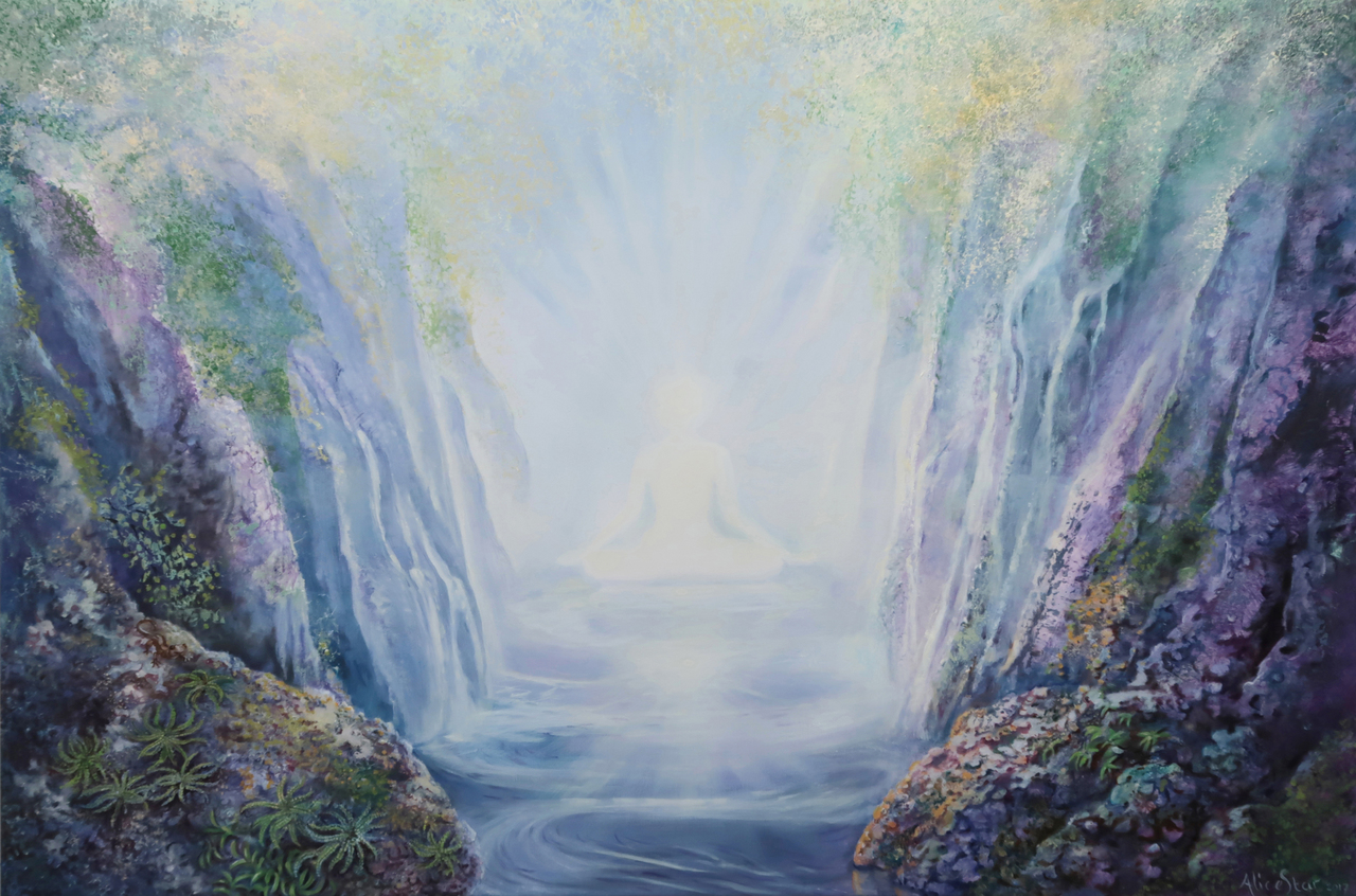 Verstilde natuur. In de lichtheid zit een mediterende figuur, ook wel definieerbaar als Boeddha. Het is een licht schilderij , zachte grijs-blauwe kleuren, een beetje mauve en zacht groen. Dit schilderij geeft een gevoel van vrijheid, een verlangen om in rond te dwalen. De vormgeving is ongebonden aan de realiteit weergegeven. De voorstelling is voortgezet op de zijkanten van het 3D doek en kan daarom zonder lijst worden opgehangen.