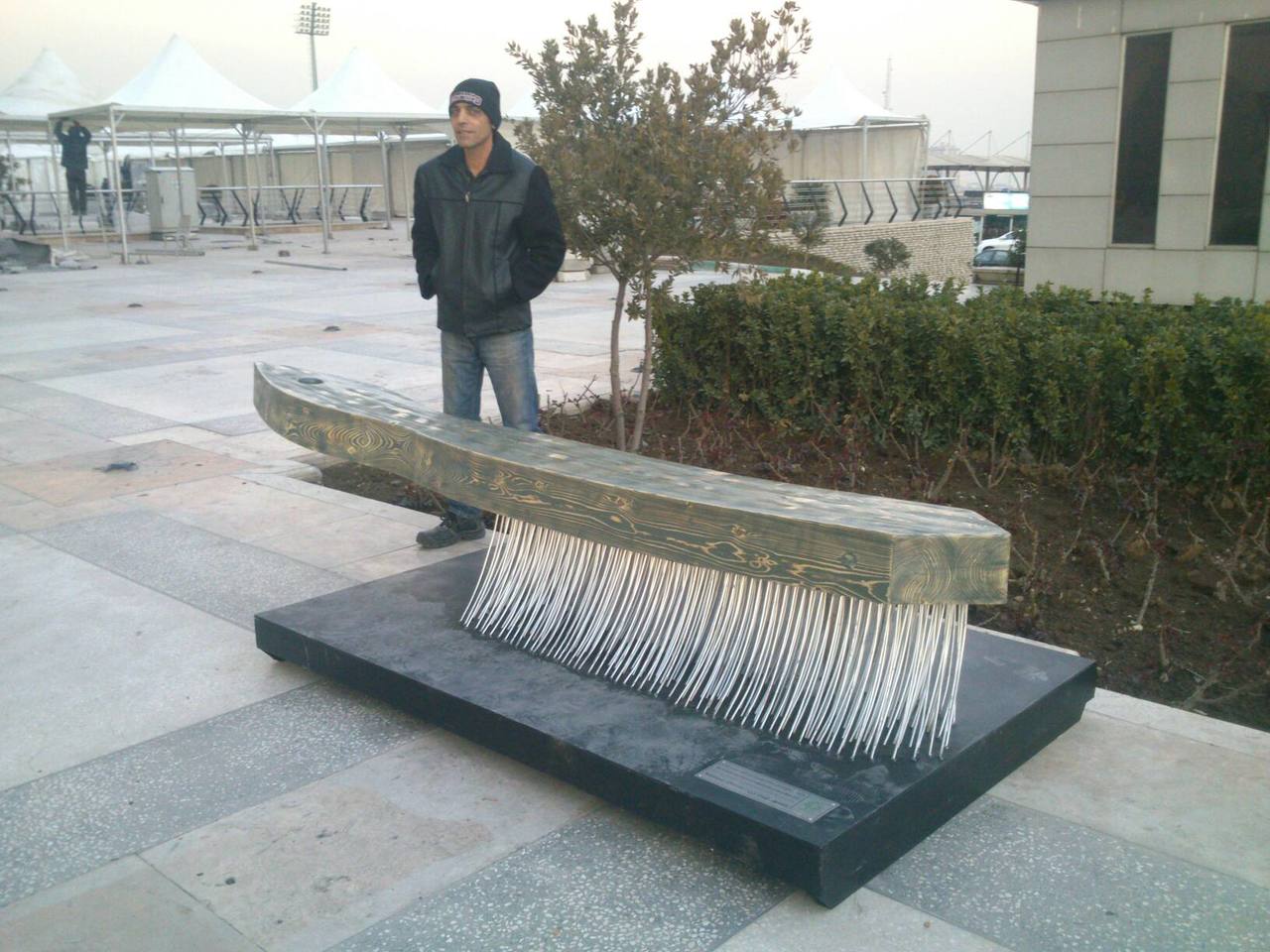 De gemeente Teheran (Iran) heeft een prijsvraag uitgeschreven voor een beeld in de openbare ruimte. Mansoor Chitzan heeft deze competitie gewonnen met dit ontwerp: bank in de vorm van een stoffer.