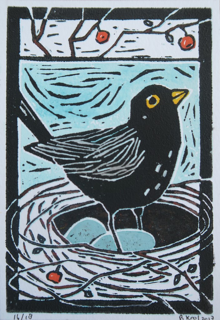 Linosnede Drukwerk Linocut Lino Kaart Natuur Dier Vogel Nest Ei Merel Blackbird Gedrukt