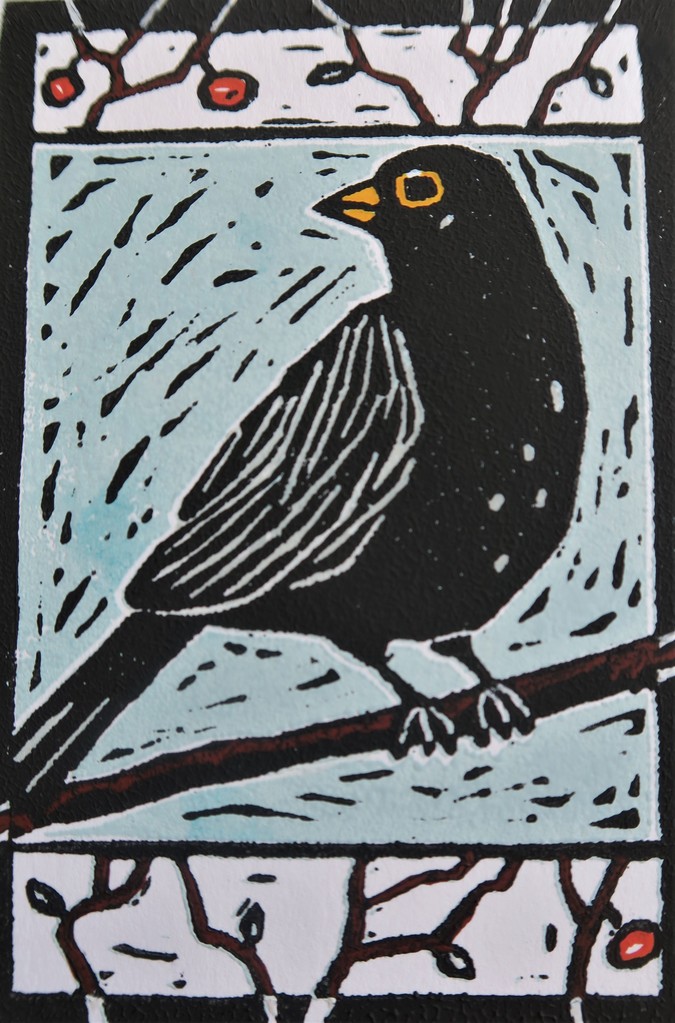 Linosnede Drukwerk Linocut Lino Kaart Natuur Dier Vogel Takken Bessen Merel Blackbird Gedrukt