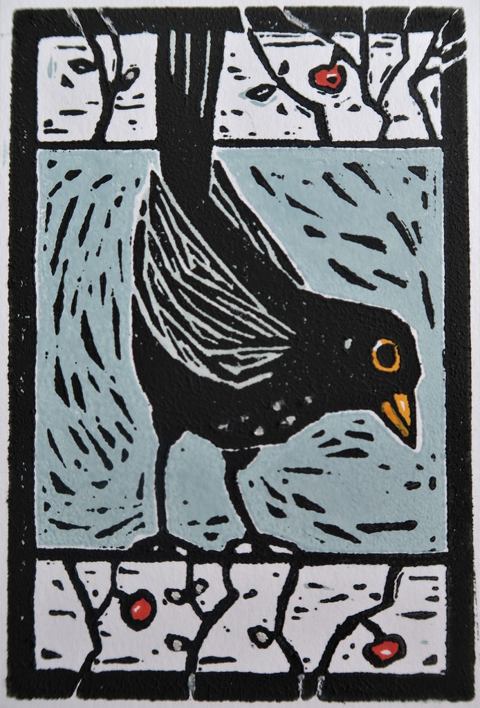 Linosnede Drukwerk Linocut Lino Kaart Natuur Dier Vogel Takken Bessen Merel Blackbird Gedrukt