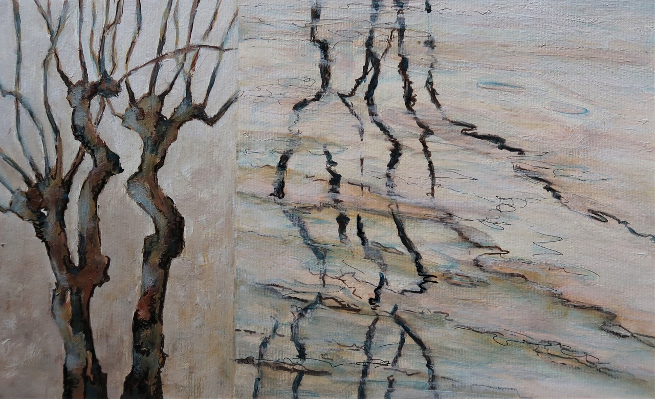 Werk uit de serie bomen en reflecties in het water. Werk is ingelijst in massief eikenhouten lijst, afmeting 30 x 40 cm.