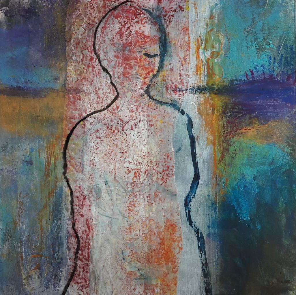 Samengaan van geschillende technieken zoals monotype, was en schilderen op plexiglas. De zwarte lijn van het plexiglas maakt voor- en achtergrond tot een geheel. In een 3D lijst ingelijst zodat reliëf en schaduwval een belangrijk onderdeel is van het werk.