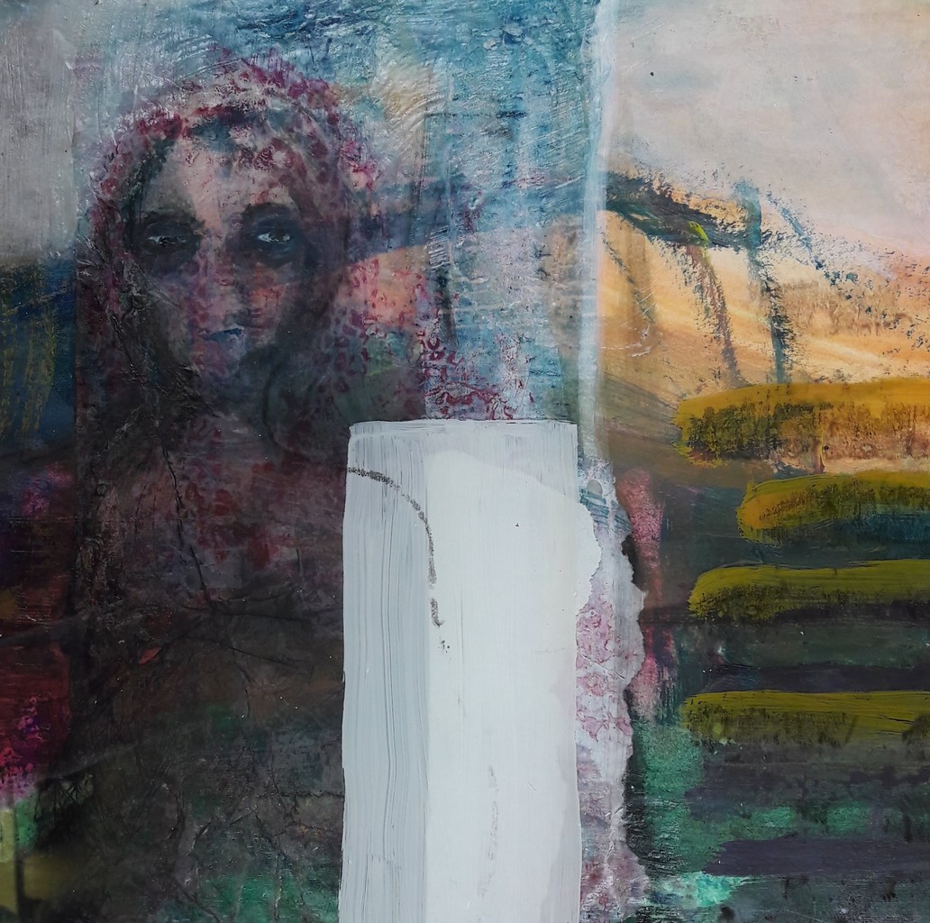 Samengaan van geschillende technieken zoals monotype, was en schilderen op plexiglas. Door een wit vlak wordt de suggestie van een ruimte gewekt. In een 3D lijst ingelijst zodat reliëf en schaduwval een belangrijk onderdeel is van het werk.