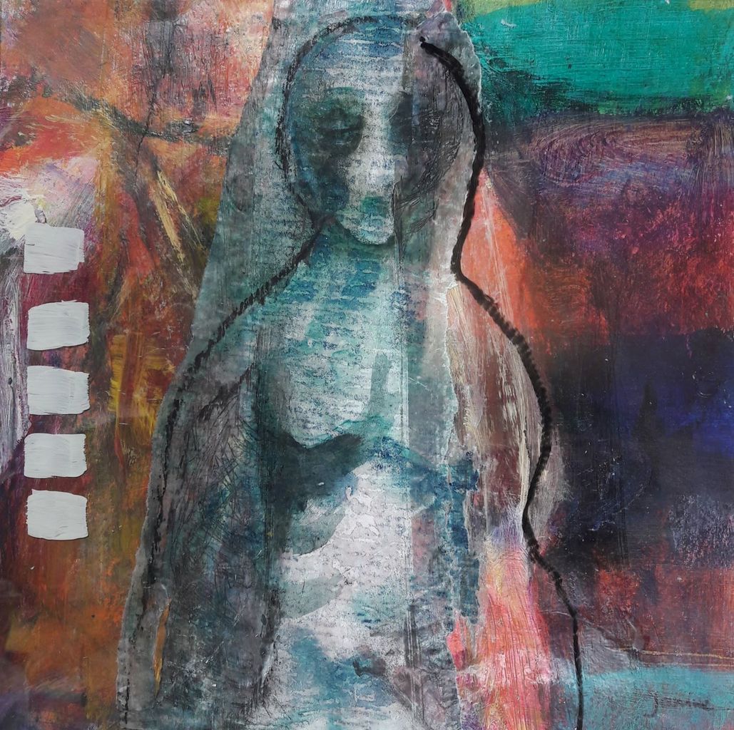 Samengaan van geschillende technieken zoals monotype, was en schilderen op plexiglas. Op de voorgrond witte vlakjes als contrast met de organische vorm. In een 3D lijst ingelijst zodat reliëf en schaduwval een belangrijk onderdeel is van het werk.