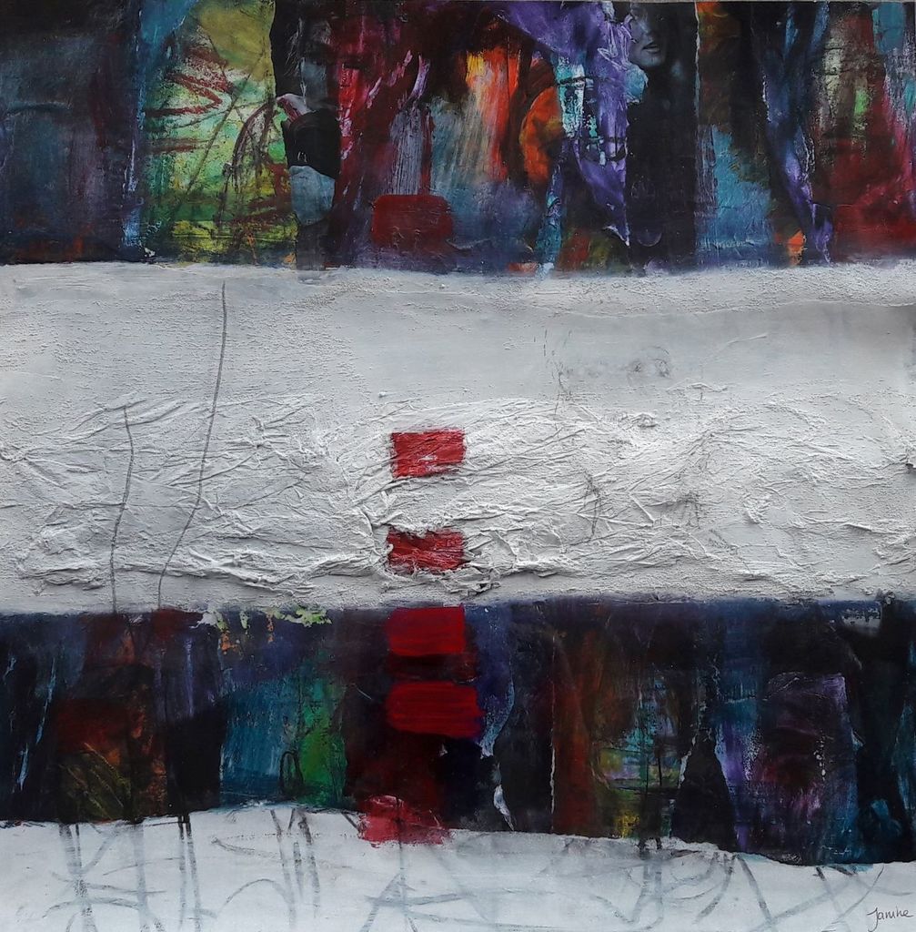 Gemengde techniek met collage van delen van eigen gemaakt werk. 2 banen bewerkt met reliëflaag. lijnen en rode vlekjes op plexiglas waardoor schaduwval een onderdeel van het werk wordt