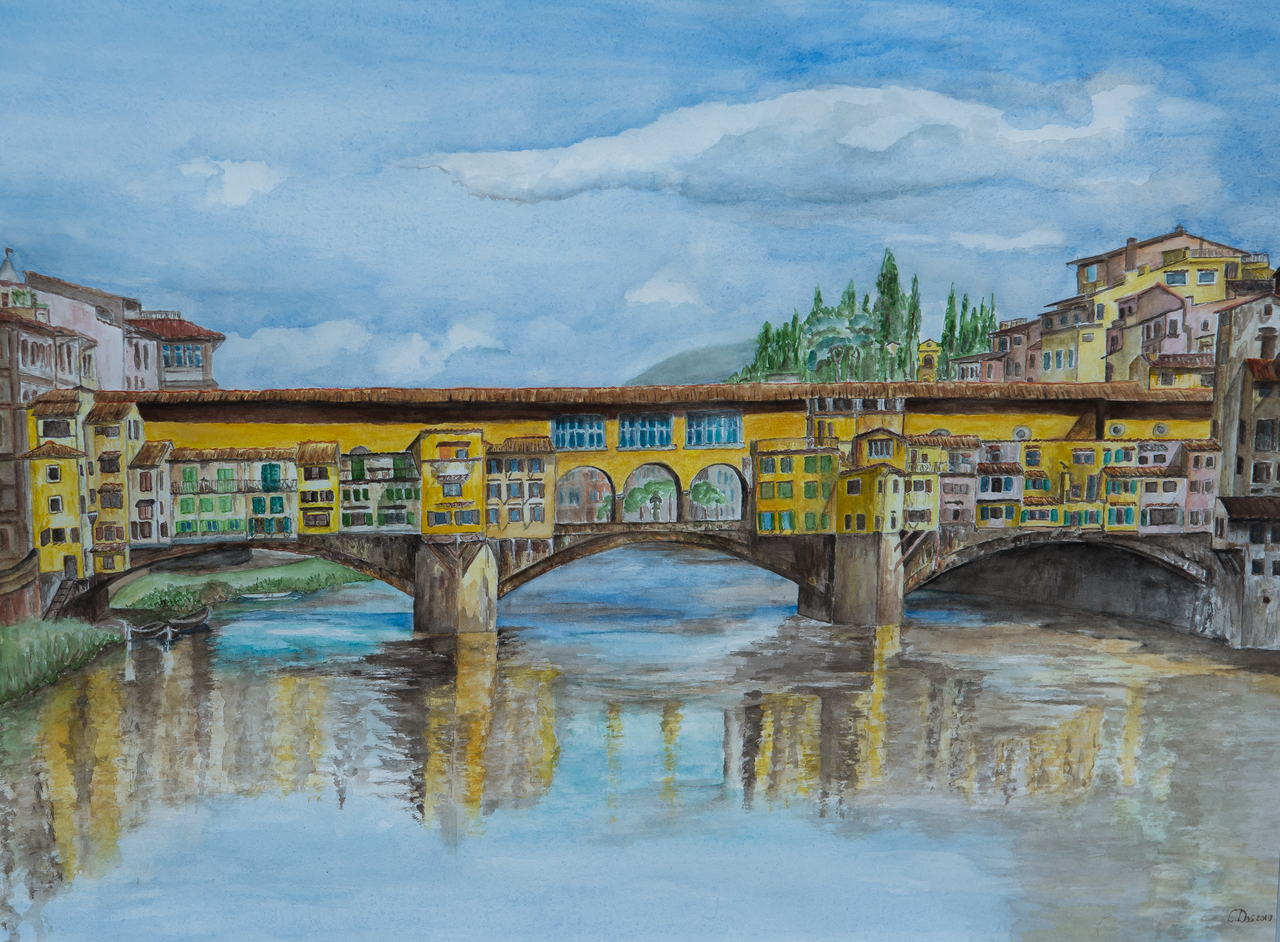 De brug Ponte Vecchio in aquarel. Geschilderd naar een foto die mijn man Eric Das op mijn verzoek heeft genomen vanaf de Ponte alla Grazie. Mijn doel was om de werkelijkheid zo natuurgetrouw weer te geven. Met name in de weerspiegeling in het water heb ik geprobeerd dit doel te bereiken door verschillende aquareltechnieken toe te passen. De prijs van dit schilderij is inclusief ingelijst.