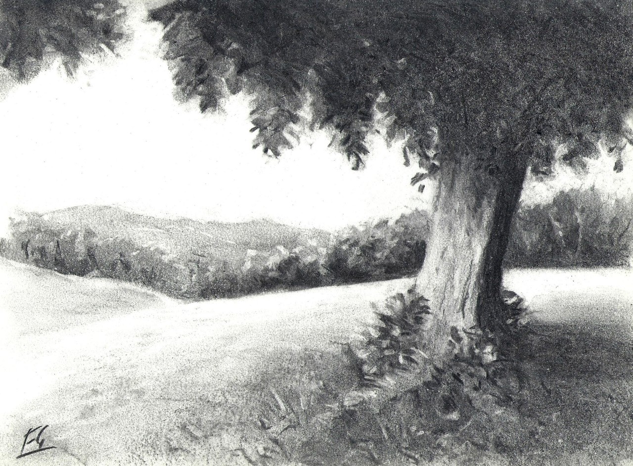 Losse houtskool studie tekening van een schaduw gevende boom in een open stuk weide.