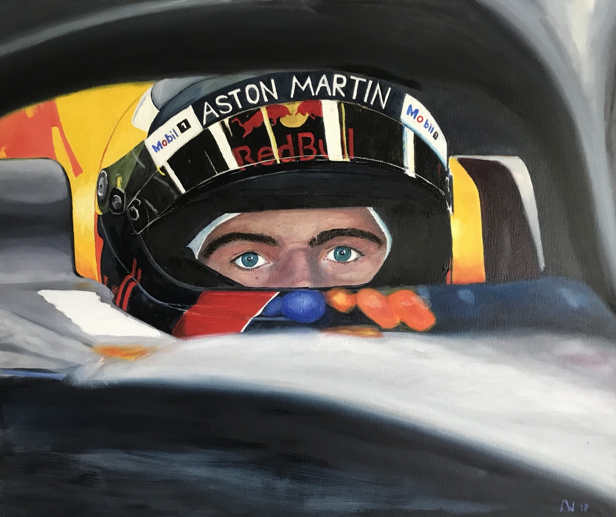 'Focus' Max Verstappen in his Formula 1 car with Red Bull Racing. Made in 2018. This is my very first portrait ever made. I choose to paint him with his helmet on, so I only had to paint his nose and eyes. For me his eyes say he is fully focused on his job.