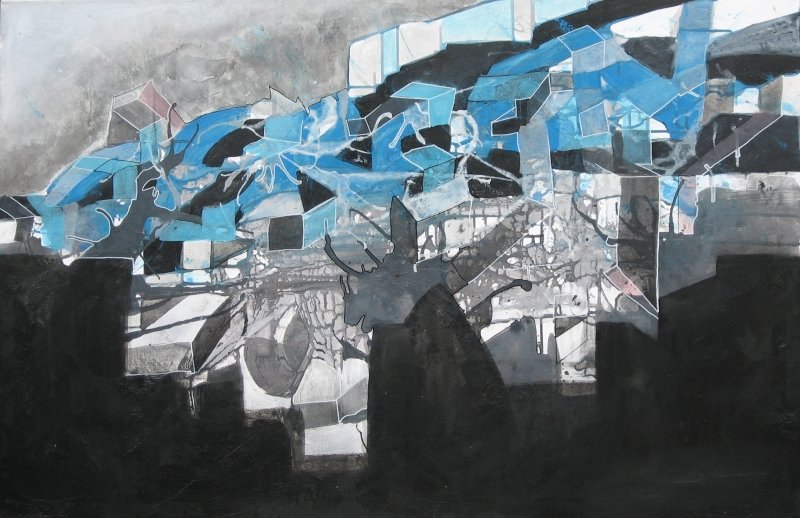 acrylschilderij waarin de volgende stap zichtbaar wordt in de strijd tussen de geometrie van de letter en het organische toeval.