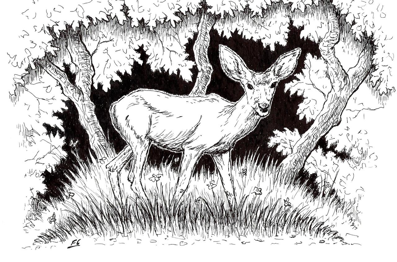 Dier Tekening Bomen Bos Gras Inkt Hert Struiken Hertje Ree