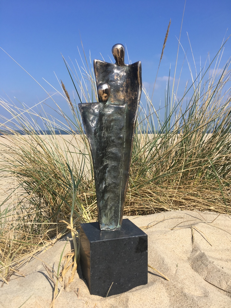 Bronzen beeld samen staat op een Belgische hardstenen sokkel 120cm 5x5cm