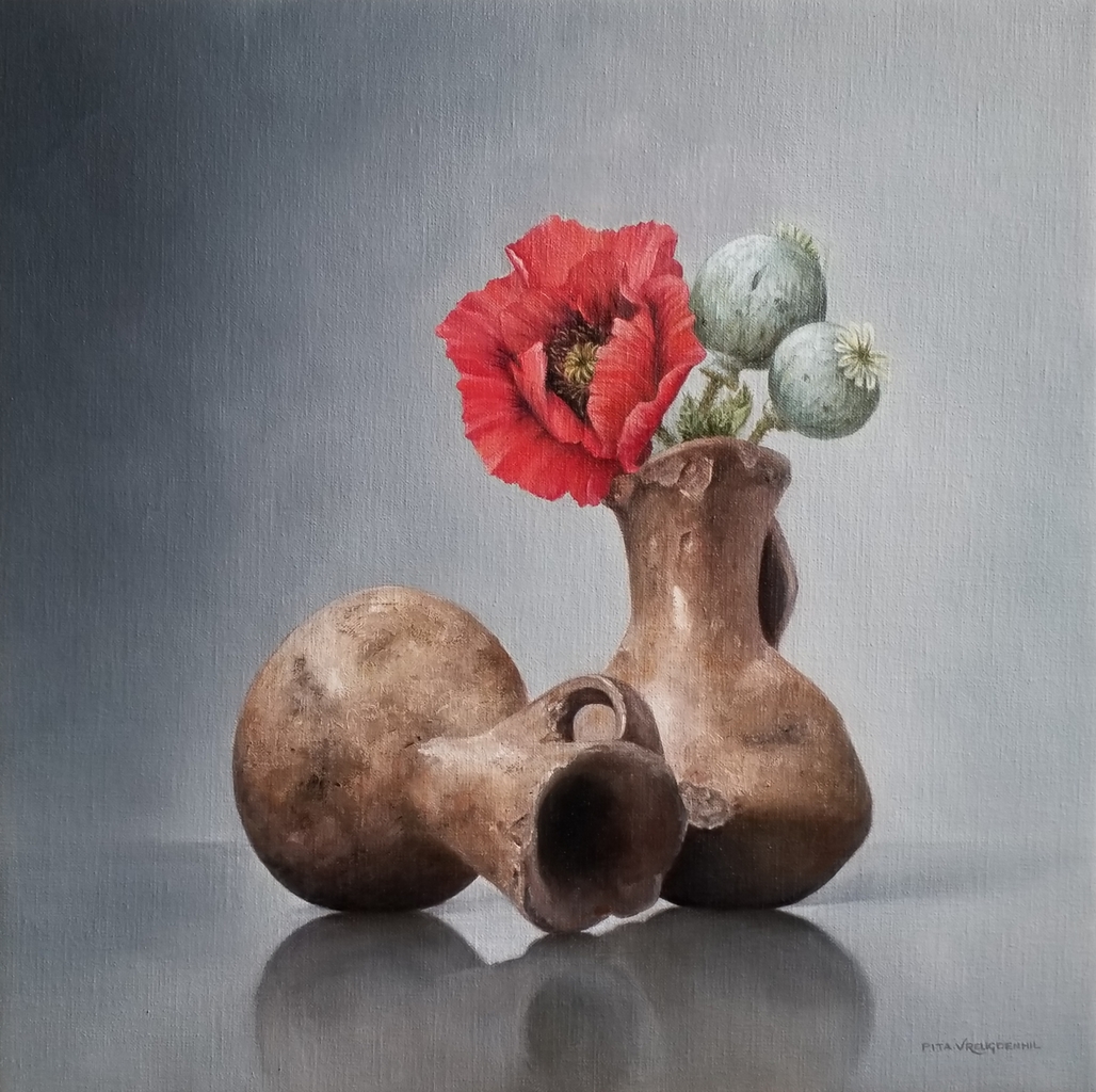 Verkocht. Stilleven met peruaans aardewerk en papavers www.pitavreugdenhil.nl