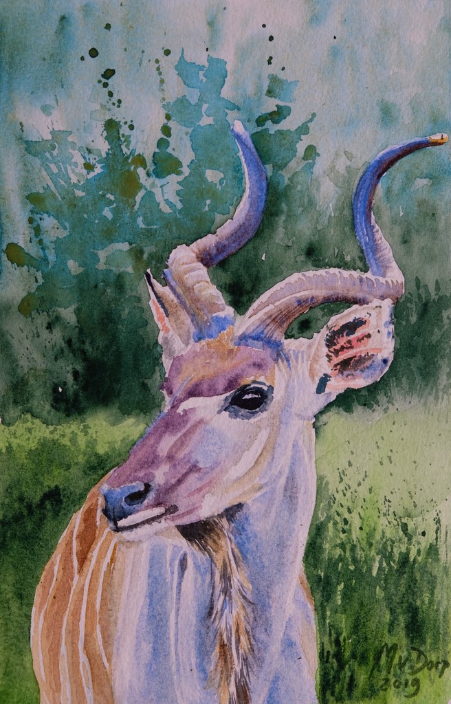 Deze kudu kon ik fotograferen terwijl ik in een wildpark in Zuid Afrika was. Hij heeft een prachtige vacht, houding en gewei. De aquarel is 25x16 cm en kost 60 euro. Van deze aquarel heb ik ook hoogwaardige giclée afdrukken op zwaar hahnemuhle papier 5 op formaat 23x14.5 cm voor 30 euro per stuk en 2 op formaat 36.5x23.5 cm voor 50 euro
