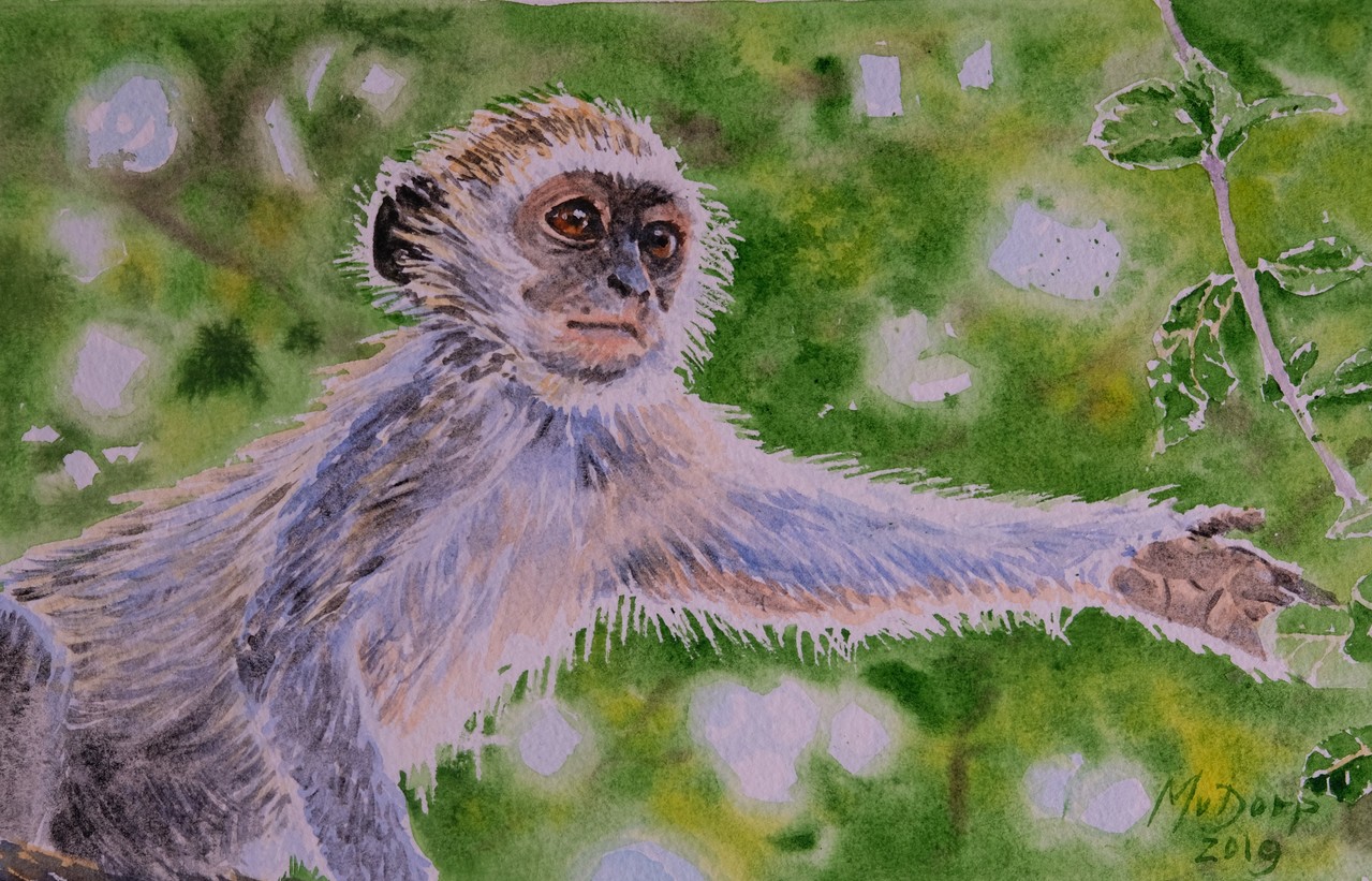 Aquarel Jong Aapje Krugerpark Zuid-afrika Blou-aap