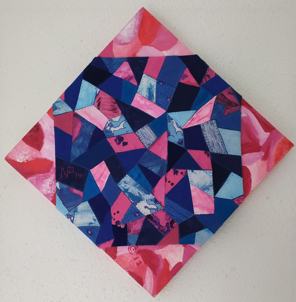Wijlen Hr.Esbach van Kunstkring-Alexander, zijn schilderijen, sommige nog onafgemaakt, zijn door de leden van de Kunstkring voor 50% in diverse diciplines, omgetoverd in nieuwe kunstwerken. Schilderij met ronde vormen in fucsia en een slapende man. Het werk gecombineerd met blauw, strakke vormen en de vrouwelijke figuur in textiel.