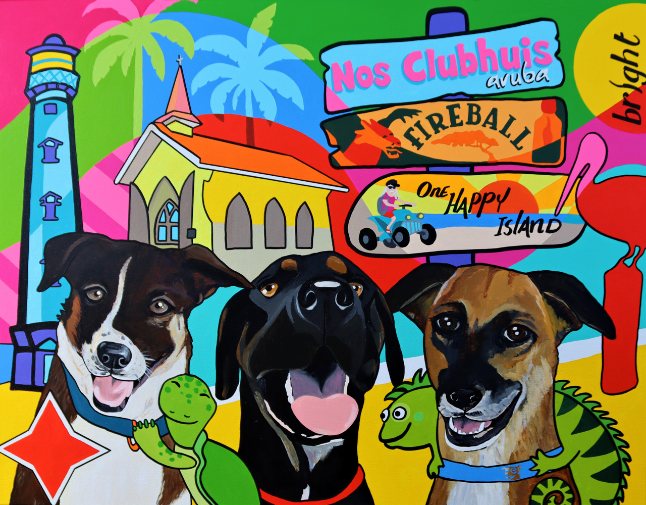 Acryl Honden Dieren Liefde Kleurrijk Canvas Painting 3 Dog Eiland Vuurtoren Paradijs Aruba Colorful Dogs Popart Caribisch Copyright Abc Musketiers Paws Dogartist Mirjamgriffioenart Mirjamgriffioen Caribbeanartist