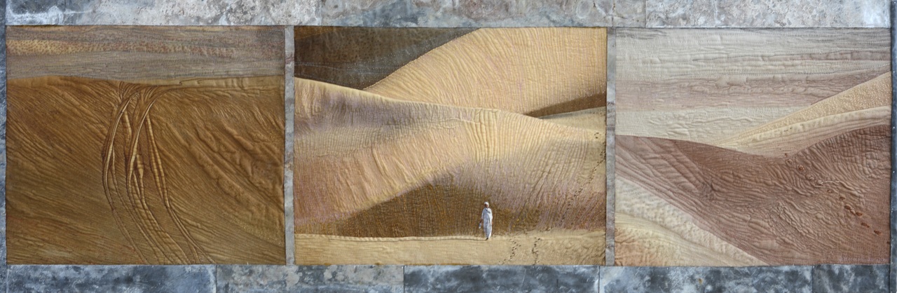 Man in wit gewaad in de Lybische woestijn keert terug van zijn gebed. Hij draagt een fles water waarmee hij zich voor het gebed gewassen heeft. Textiel, met wol, draad, stiksels en acrylverf. Omlijst met rand van lood