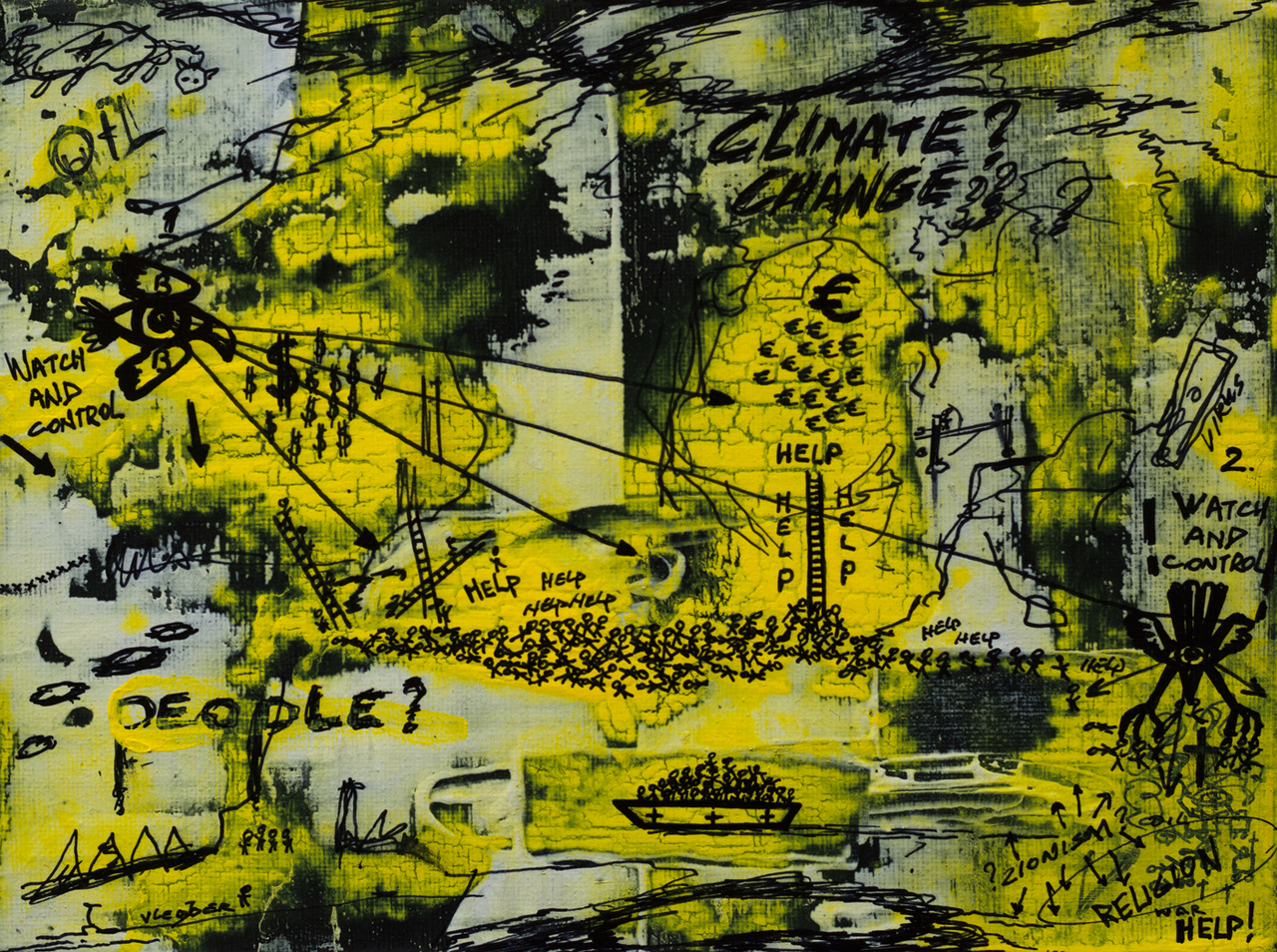 Mensen Geel Toneel Acrylverf Oorlog Wereld Marker Vluchtelingen Macht Geld Klimaat Controle