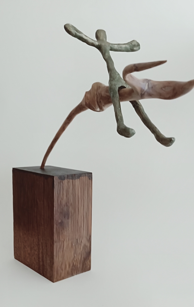 Mijn objecten komen vaak voort uit gevonden voorwerpen. Ik combineer hout, met zelf ontworpen bronzen beelden en natuurlijke materialen.