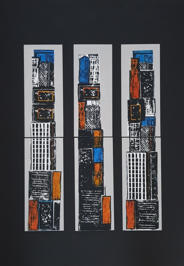 drie torens gestapeld uit delen van andere gebouwen, monoprint / linosnede / collage