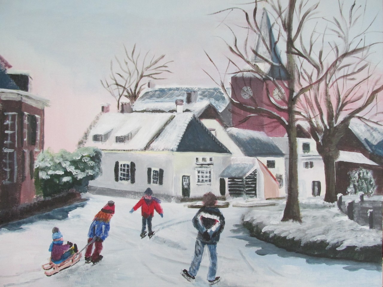 Wintertafereel op canvas paneel 40x50 cm. met acryl. zonder lijst