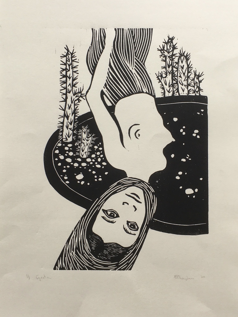 "Greta" Een lino van een bevlogen meisje. https://www.artfinder.com/marion-snijders#/
