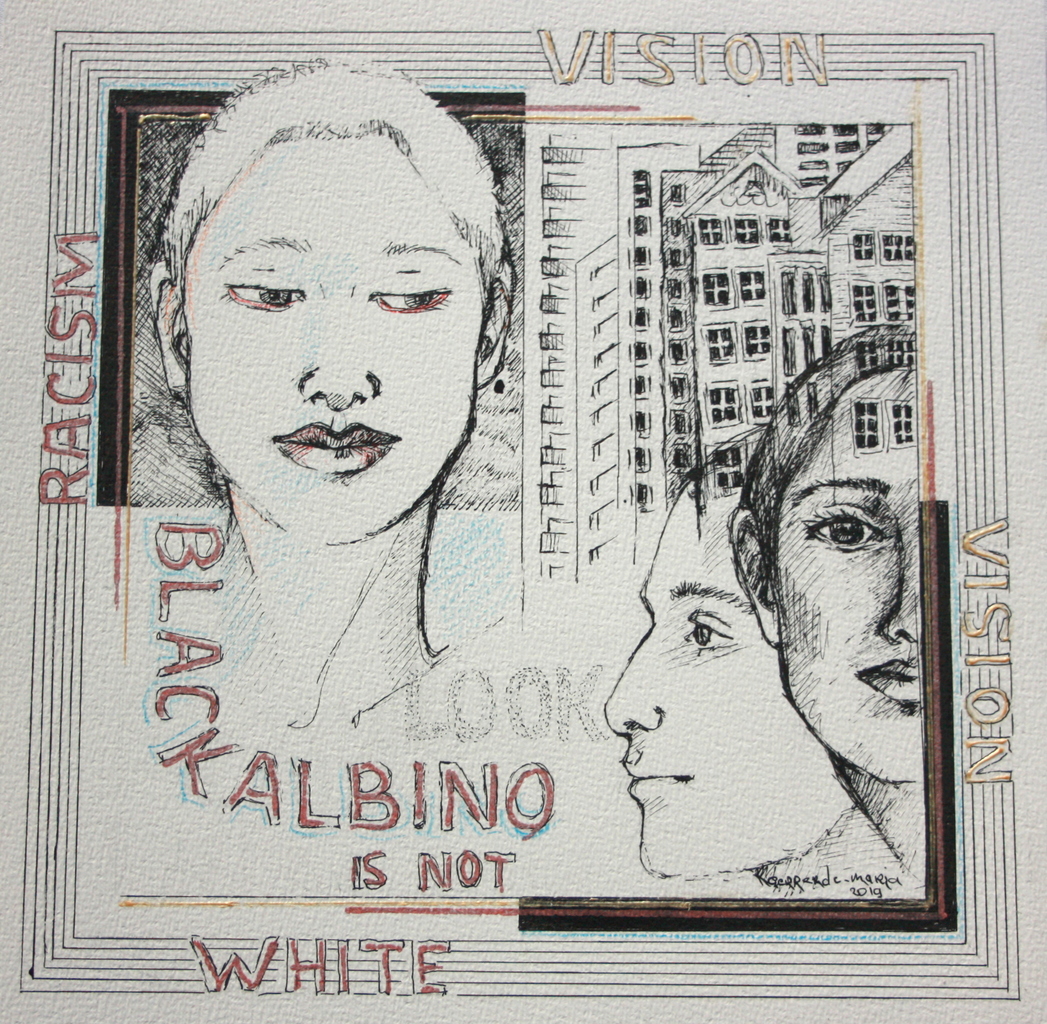 Dit werk gaat over de enorme problemen die albino's hebben in Afrika. ze zijn blank maar worden gediscrimineerd, misbruikt / vermikt voor magische rituelen en vermoord in Afrika