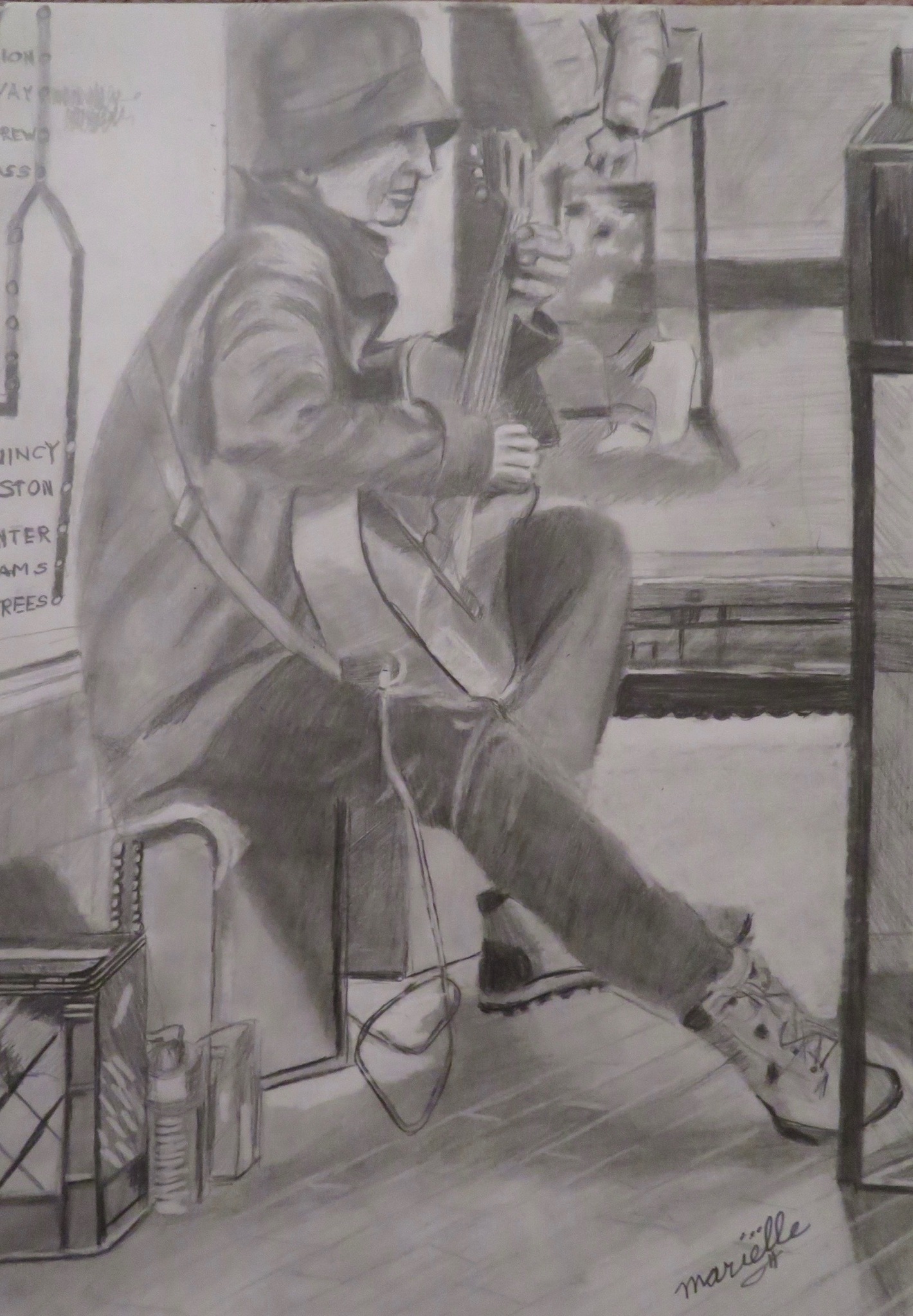 This man was playing guitar in the Boston subway. He played well and I was impressed by his music. I wanted to dwell on this moment with this drawing. Apparently he had earned well quickly, because when we returned after an hour, he had left