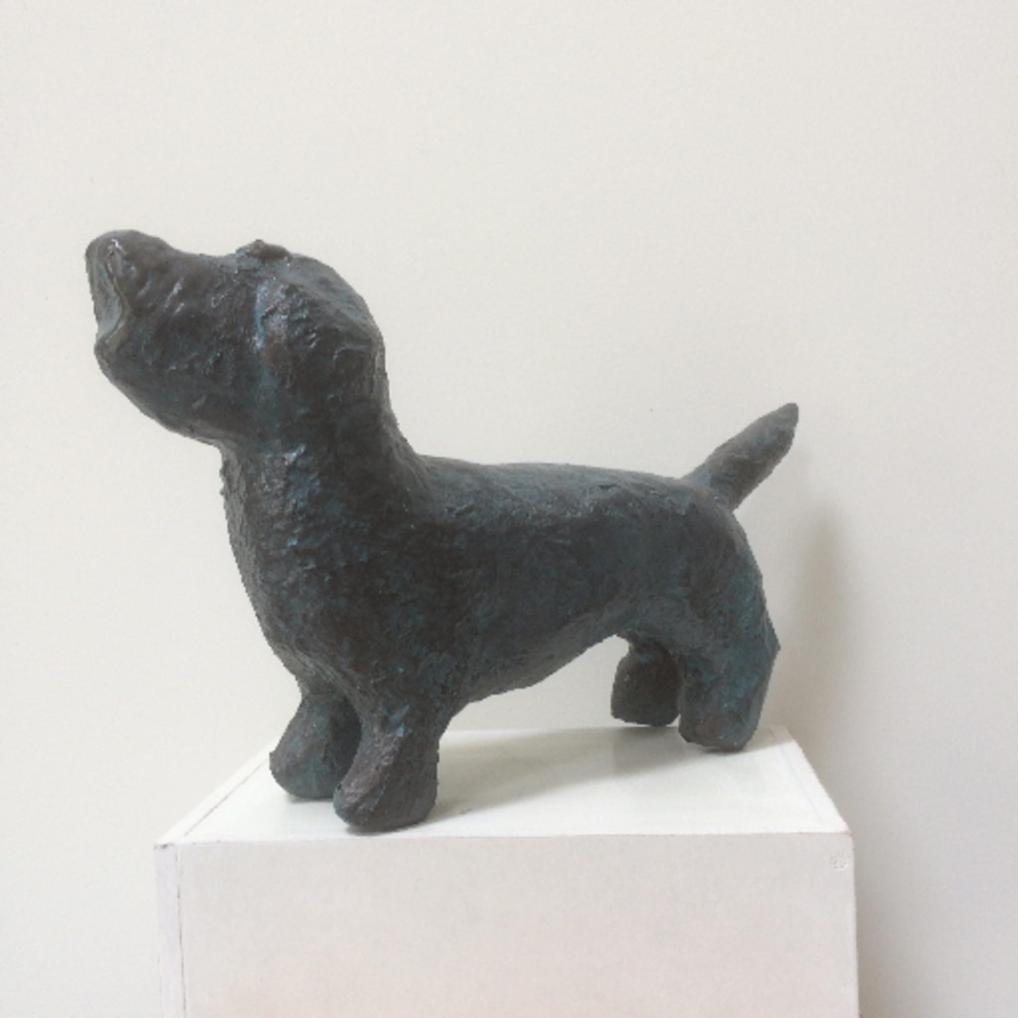 Grappig hondje. Gemaakt van kunsthars. Brons look. Geschikt voor buiten.