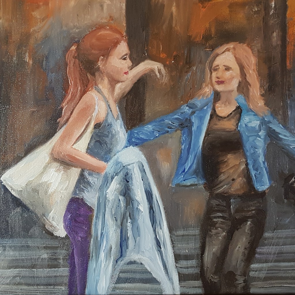 Art Olieverf Vriendinnen Meisjes Personen Ontmoeting Muur Vreugde