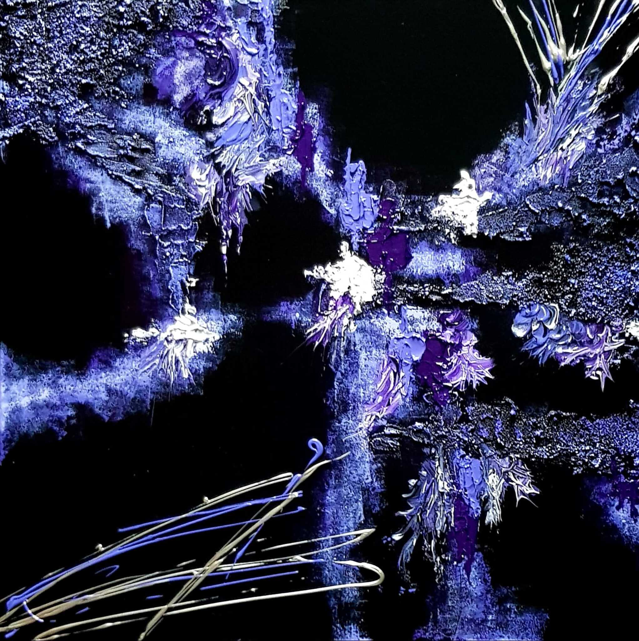 "Elan" is het eerste kunstwerk dat ik in 2020 vervaardigd heb. Net als bij de vorige twee werken ben ik uitgegaan van een donkere achtergrond. De kleur paars speelt dit keer de hoofdrol, hier en daar geaccentueerd met zilverkleurige toevoegingen. Wederom werk ik met structuurmaterialen, opgebracht met paletmes, spons en roller. "Elan" laat alles zien wat de titel doet vermoeden. Flair, enthousiasme, gedrevenheid, vuur, vervoering,gloed, vaart, bevlogenheid! Laat je meevoeren en overrompelen door de felle kleuren en mysterieuze vormen.